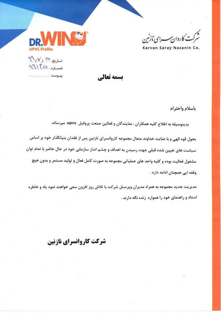 پنجره‌ایرانیان؛ مجموعه تولیدی صنعتی کاروانسرای نازنین (دکتر وین) با صدور اطلاعیه‌ای از ادامه روند فعالیت‌های تولیدی این مجموعه پس از درگذشت شادروان حقانی، مدیرعامل فقیدشان با توان و قدرت بیشتر خبر داد.