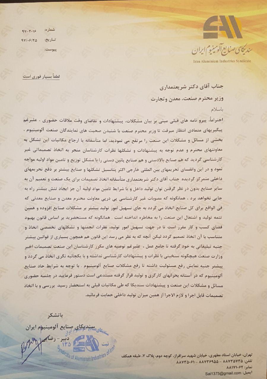 پنجره‌ایرانیان؛ سندیکای صنایع آلومینیوم با ارسال نامه‌ای به شریعتمداری، خواستار برگزاری جلسه فوری با ایشان به‌منظور بهبود فضای کسب‌وکار این صنعت شدند.