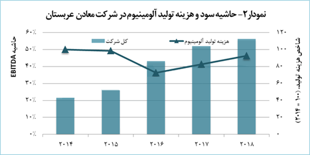 روند افزایشی تولید و فروش شرکت معادن عربستان طی سالهای گذشته، به بهبود نتایج مالی این شرکت نیز کمک کرد. نمودار 2، عملکرد مالی شرکت معادن عربستان در بخش زنجیره آلومینیوم را طی 5 سال گذشته نشان میدهد. همانطور که در این نمودار مشاهده میشود، مقدار حاشیه EBITDA آن در زنجیره آلومینیوم از حدود 22 درصد در سال 2014 به حدود 56 درصد در سال 2018 افزایش یافته است. لازم به اشاره است که یکی از مهمترین دلایل حاشیه سود بالای این شرکت، فعالیت آن در تمامی حلقههای بالادستی زنجیره آلومینیوم است. حتی حوزه فعالیت این شرکت در این زنجیره نیز تا نورد در بخش پاییندستی این صنعت توسعهیافته است. تامین تمامی مواد اولیه تولید هر حلقه از فعالیت این شرکت توسط درون شرکتی، هزینههای تولید آن را به مقدار قابلتوجهی کاهش داده است؛ بهطوریکه حتی مقدار هزینه تولید آلومینیوم این شرکت در سال 2016 که با راهاندازی فاز دوم پالایشگاه آلومینای آن همزمان بود، هزینه تولید آلومینای آن را تا 1،290 دلار بهازای هر تن کاهش داد.