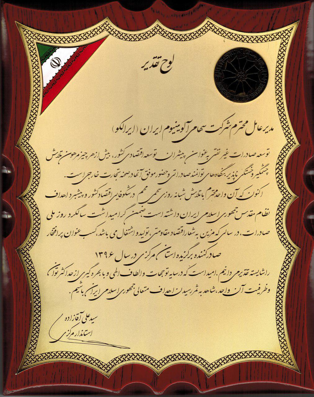 پنجرهایرانیان؛ در مراسمی که با حضور استاندار و فعالان اقتصادی استان مرکزی برگزار شد از شرکت آلومینیوم ایران (ایرالکو) صادرکننده برتر استان با اهداء لوح و تندیس تقدیر شد.