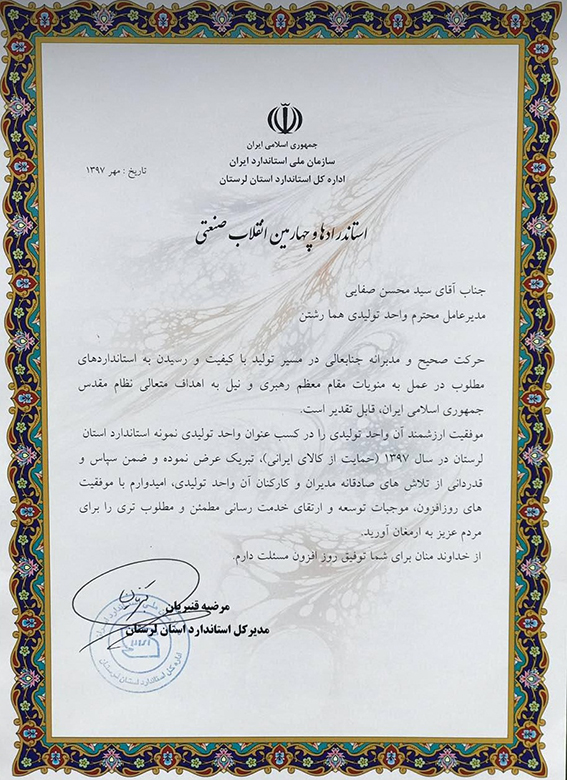پنجرهایرانیان؛ گروه صنعتی همارشتن در مراسم بزرگداشت روز جهانی استاندارد بهعنوان واحد نمونه استان لرستان انتخاب شد.