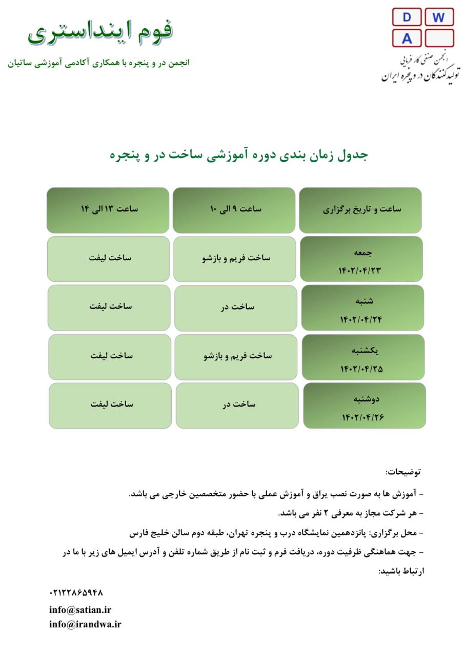 پنجرهایرانیان؛ جدول زمانبندی کارگاههای آموزشی ساخت دروپنجره آکادمی ساتیان در پانزدهمین نمایشگاه دروپنجره تهران منتشر شد.