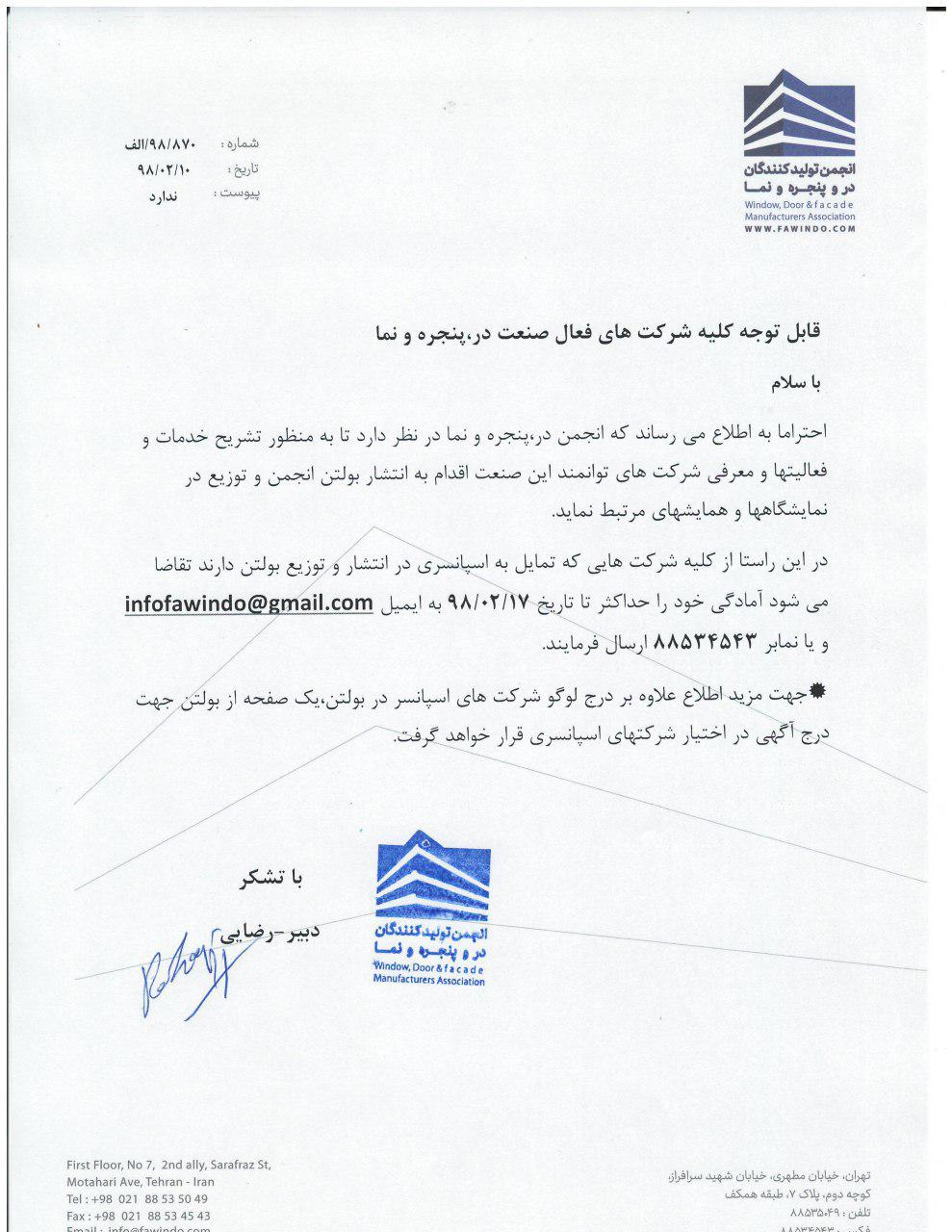 انجمن تولیدکنندگان در، پنجره و نما درنظر دارد بهمنظور تشریح خدمات و فعالیتها و معرفی شرکتهای برتر این صنعت اقدام به انتشار بولتن تبلیغاتی و توزیع آن در نمایشگاهها و همایشهای مرتبط کند. در این راستا از شرکتها و مجموعههایی که تمایل به مشارکت و اسپانسری در این پروژه را دارند تقاضا میشود آمادگی خود را تا تاریخ 17 اردیبهشتماه 98 به دفتر این انجمن ارسال کنند.
