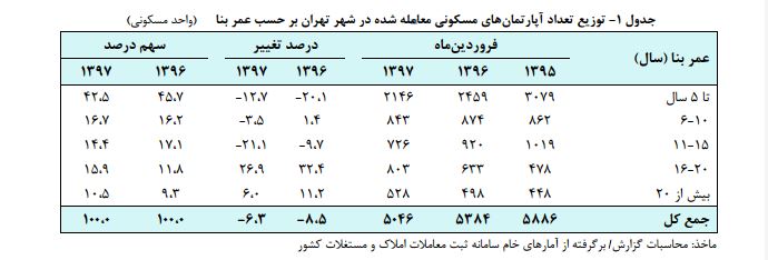 بررسی توزیع تعداد واحدهای مسکونی معاملهشده در شهر تهران به تفکیک عمر بنا در فروردینماه سال ۱۳۹۷ حاکی از آن است که از مجموع ۵۰۴۶ واحد مسکونی معاملهشده، واحدهای تا ۵ سال ساخت با سهم ۴۲/۵ درصد بیشترین سهم را به خود اختصاص دادهاند. سهم مذکور در مقایسه با فروردینماه سال قبل ۳/۲ واحد درصد کاهشیافته و در مقابل به سهم واحدهای با قدمت ۶ تا ۱۰ سال و بیش از ۱۵ سال افزوده شده است.