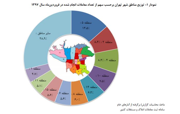 توزیع تعداد معاملات انجامشده برحسب مناطق مختلف شهر تهران در فروردینماه سال ۱۳۹۷ حاکی از آن است که از میان مناطق ۲۲ گانه شهر تهران، منطقه ۵ با سهم ۱۳/۵ درصدی از کل معاملات، بیشترین تعداد قراردادهای مبایعهنامه را به خود اختصاص داده است.