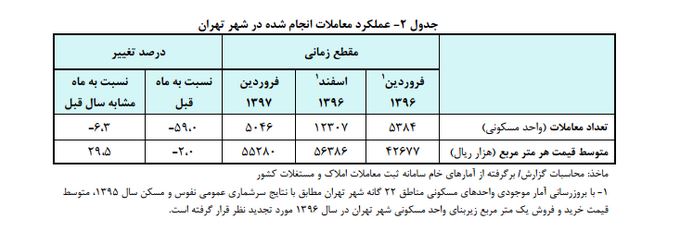 در فروردینماه سال ۱۳۹۷ متوسط قیمت خریدوفروش یک مترمربع واحد مسکونی در شهر تهران به ۵۵.۳ میلیون ریال رسید که نسبت به ماه مشابه سال قبل ۲۱.۵ درصد افزایش نشان میدهد. تعداد معاملات انجامشده طی این ماه ۵.۰ هزار فقره بود که نسبت به فروردینماه سال ۱۳۹۶ معادل ۶.۳ درصد کاهش دارد.