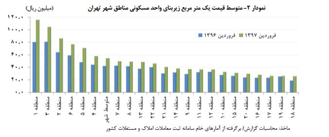 در میان مناطق ۲۲ گانه شهرداری تهران، بیشترین متوسط قیمت یک مترمربع زیربنای مسکونی معاملهشده معادل ۱۱۶.۴ میلیون ریال به منطقه یک و کمترین آن با ۲۶.۴ میلیون ریال به منطقه ۱۸ تعلق داشته است. ارقام مزبور نسبت به ماه مشابه سال قبل به ترتیب ۴۳.۹ و ۳۳.۹ درصد افزایش نشان میدهد.