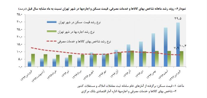 بررسی تحولات بازار اجارهبهای مسکن در فروردینماه سال ۱۳۹۷ مؤید تغییر متناسب اجارهبها با نرخ تورم در این دوره است بهطوریکه شاخص کرایه مسکن اجاری در شهر تهران و در کل مناطق شهری نسبت به ماه مشابه سال قبل به ترتیب ۱۰.۰ و ۱.۳ درصد رشد نشان میدهد.
