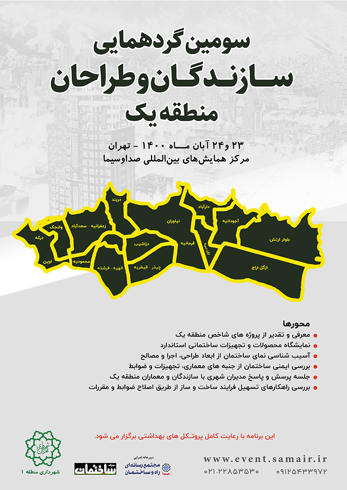 به گزارش صما، مرکز همایشهای بینالمللی صداوسیمای تهران، میزبان سومین گردهمایی سازندگان و طراحان منطقه یک خواهد بود که در تاریخ ۲۳ و ۲۴ آبانماه 1400 توسط مجتمع رسانهای راه و ساختمان و با همکاری شهرداری منطقه یک تهران برگزار خواهد شد.