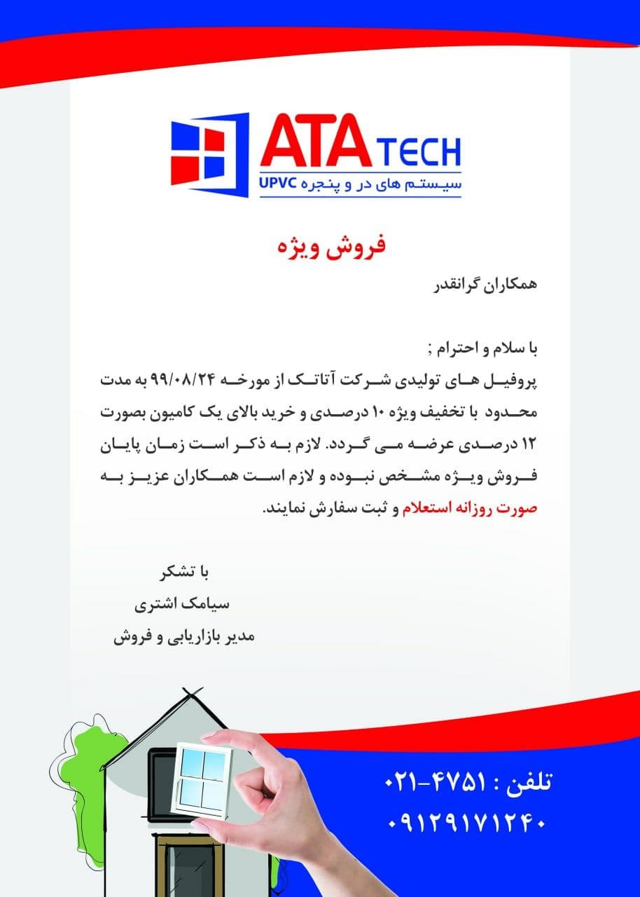 به گزارش پنجره‌ایرانیان به نقل از روابط عمومی آتاتک، گروه تولیدی صنعتی آتاتک با صدور اطلاعیه‌ای از آغاز طرح فروش ویژه همراه با تخفیف 10 تا 12 درصدی محصولاتش خبر داد. در این طرح فروش ویژه کلیه محصولات پروفیل آتاتک با 10 درصد و در صورت خرید کامیونی با 12 درصد تخفیف به مشتریان عرضه می‌شوند.