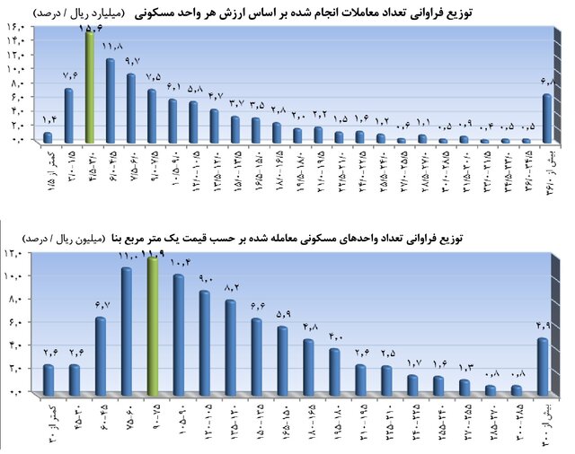 نکته جالبتوجه اینکه باوجود جهش سنگین قیمت مسکن ۵.۲ درصد معاملات مربوط به واحدهای با قیمت کمتر از ۴.۵ میلیون تومان در هر مترمربع است.