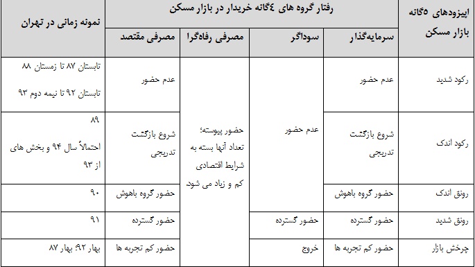 هادی کوزهچی در کتاب استراتژی سرمایهگذاری در بازار مسکن ایران، با تمرکز بر بر تحولات و چشمانداز 1393 و 1394 ایران که به تازگی منتشر شده رفتار خریداران را به 4 دسته تقسیم شده اند و رفتار آنها در 5 اپیزود مورد بررسی قرار گرفته است که خلاصه آن در جدول زیر نشان داده شده است.