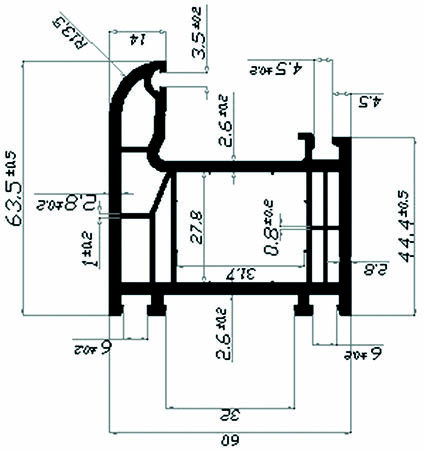 برای این که این موضوع بیشتر روشن شود،  لطفا به شکل سطح مقطع پروفیل ذیل توجه فرمائید: به نظر شما آیا این شکل سطح مقطع انتخاب درستی است؟ اگر نیست چه ایراداتی دارد؟ متاسفانه این شکل سطح مقطع پروفیل فریم (سری 60) دارای ایراداتی است که توسط یک شرکت ترکیه‌ای به یکی از مشتریان ما با قیمت نسبتا بالا توصیه شده بود. جهت آگاهی تولیدکنندگان در و پنجره پروفیل یوپی‌وی‌سی ایران به بعضی از این ایرادات اشاره می‌شود: 1) در دیواره بالایی پروفیل محل استقرار شیار باران بدون انحنا و شیب مناسب است. 2) دیواره‌های داخلی پروفیل به همدیگر بسیار نزدیک بوده که ممکن است پس از خروج از قالب به همدیگر بچسبند. 3) با توجه به این که این پروفیل سری 60 است، انتخاب 5 حفره برای آن مناسب نیست. 4) وزن پروفیل نسبتا سنگین و غیر اقتصادی (1320 gr/m) در می‌آید و در نهایت این ایرادات توسط یکی از تأمین‌کنندگان قالب ما یعنی کمپانی (Jari Toolings) برطرف شده و شکل مناسب به مشتری توصیه شد.