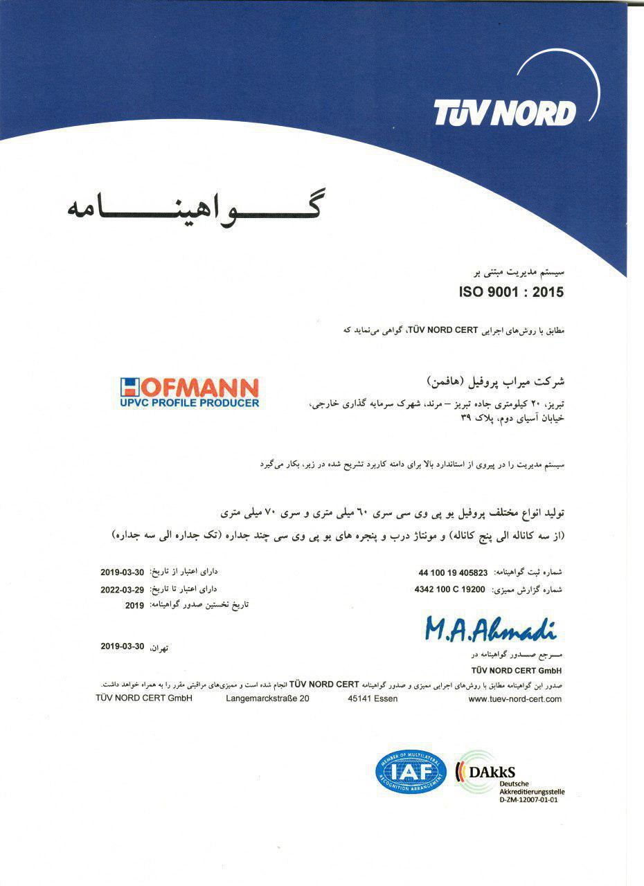 پنجرهایرانیان؛ هافمن موفق به اخذ گواهینامه سیستم مدیریت مبتنی بر Iso 9001:2015 از TUV-NORD آلمان شد.