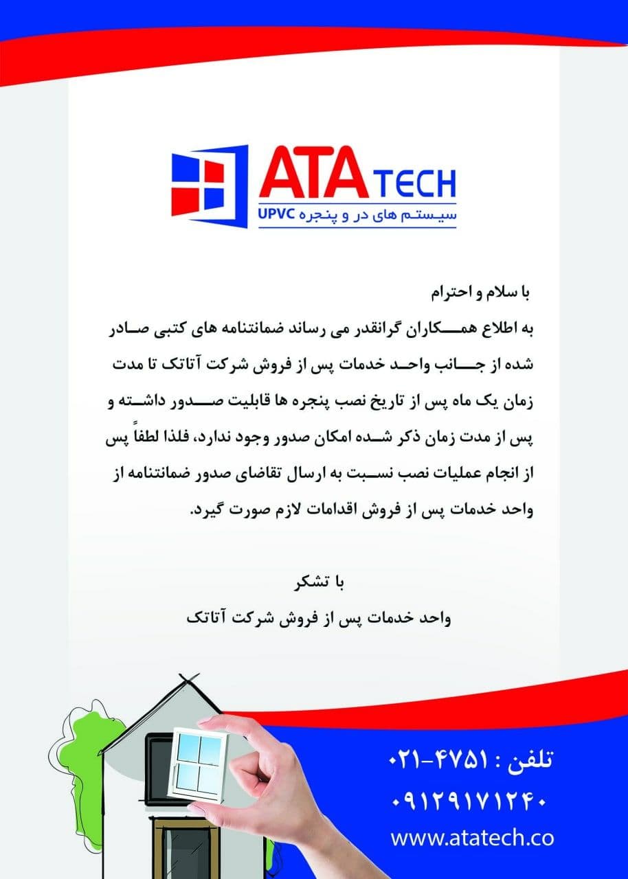 به اطلاع همکاران گرانقدر میرساند، ضمانتنامههای کتبی صادرشده از جانب واحد خدمات پس از فروش شرکت آتاتک تا مدتزمان یک ماه پس از تاریخ نصب پنجرهها قابلیت صدور داشته و پس از مدتزمان ذکرشده امکان صدور وجود ندارد؛ فلذا خواهشمندیم پس از عملیات نصب نسبت به ارسال تقاضانامه صدور ضمانتنامه از واحد خدمات پس از فروش اقدامات لازم صورت گیرد.