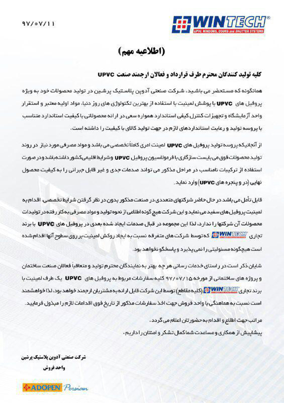 شرکت آدوپن پلاستیک پرشین در اطلاعیهای به خریداران پروفیلهای یو.پی.وی.سی لمینت شده هشدار داد که هیچگونه مسئولیتی در قبال پروفیلهای بانام تجاری WINTECH که توسط شرکتهای متفرقه لمینت شدهاند، به عهده نمیگیرد.