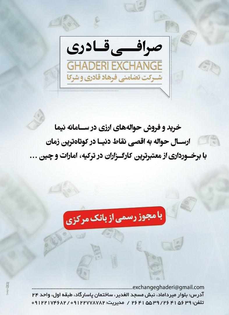 قادری در پایان یادآور شد: صرافی قادری به نشانی تهران، بلوار میرداماد، نبش مسجد الغدیر، طبقه اول ساختمان پاسارگاد آماده ارائه خدمات مختلف ارزی به تجار، بازرگانان و فعالان اقتصادی کشور است.