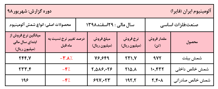 پنجرهایرانیان؛ نرخ فروش محصولات اصلی شرکت آلومینیوم ایران بهطور میانگین ۴ درصد کاهش قیمت را نسبت به مردادماه داشت.