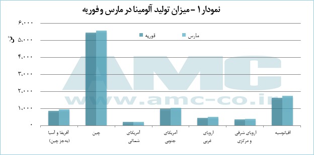 به گزارش فلزات آنلاین، همان‌طور که در نمودار 1 آمده است، کشور چین که بزرگ‌ترین تولیدکننده آلومینا در جهان است، در ماه فوریه، پنج میلیون و 445 هزار تن آلومینا تولید کرد و تولید این ماده در کشور چین در ماه مارس 2 درصد افزایش یافت و به پنج میلیون و 570 هزار تن رسید. این میزان نسبت به مدت‌زمان مشابه در سال گذشته که میزان تولید آلومینا در کشور چین، 6 میلیون و 47 هزار تن بود، 477 هزار تن افت را تجربه کرده است.