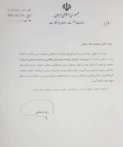 پنجرهایرانیان؛ جمشید ملارحمان از سوی وزیر صنعت و معدن تجارت به ریاست ایمیدرو (سرپرست) منصوب شد.
