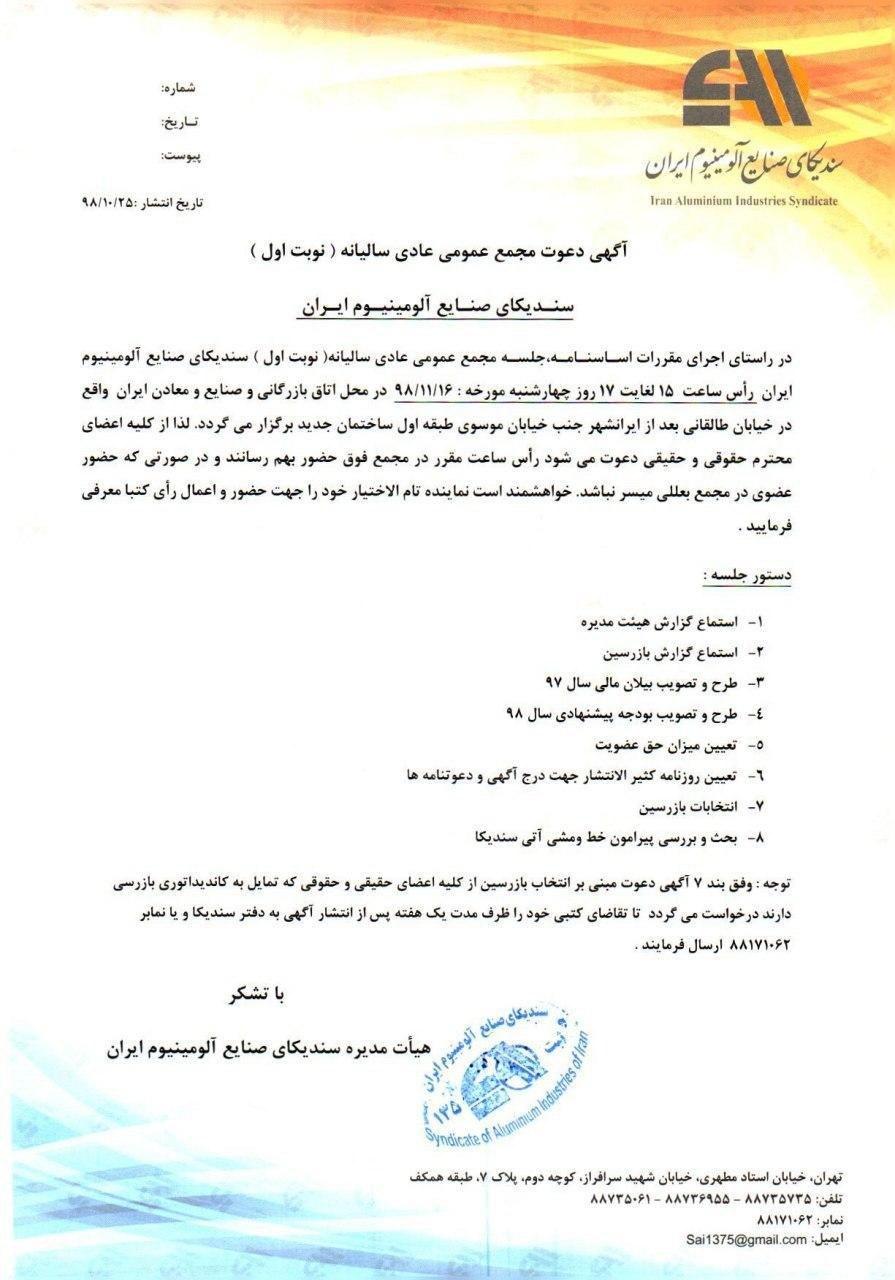 در راستای اجرای مقررات اساسنامه، مجمع عمومی عادی سالیانه (نوبت اول) سندیکای صنایع آلومینیوم ایران 16 بهمنماه سال جاری در محل اتاق بازرگانی، صنایع و معادن ایران برگزار میشود. این جلسه از ساعت 15 تا 17 روز چهارشنبه 16 بهمنماه 1398 بهمنظور استماع گزارش هیات مدیره و بازرسان، تصویب بیلان مالی سال 98 و طرح و تصویب بودجه پیشنهادی سال 99، تعیین میزان حق عضویت و انتخاب روزنامه کثیرالانتشار جهت درج آگهی و دعوتنامهها و همچنین انجام انتخابات بازرسین و بحث و بررسی پیرامون خطمشی آتی سندیکا پذیرای عموم اعضای حقیقی و حقوقی یا نمایندگان تامالاختیار آنها خواهد بود.