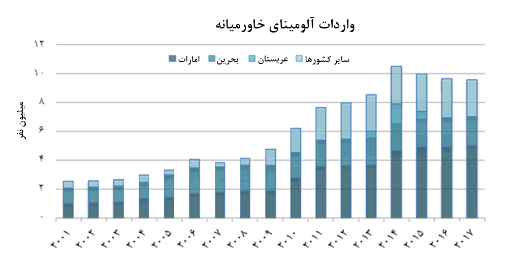به گزارش فلزات آنلاین، در نمودار زیر، حجم واردات آلومینای خاورمیانه نشان داده شده است. مقدار واردات آلومینای خاورمیانه از حدود 2.5 میلیون تن در سال 2001، با نرخ رشد متوسط سالانه 8.7 درصدی به‌حدود 9.6 میلیون تن در سال 2017 رسید. البته، مقدار واردات این منطقه در سال 2014، حتی از 10 میلیون تن نیز فراتر رفته و به 10.5 میلیون تن رسید. دلیل اصلی افزایش حجم واردات آلومینا در این سال، مربوط به عربستان بود که واحد ذوب آن مرحله بهره‌برداری آزمایشی را پشت سر گذاشته بود، ولی ظرفیت پالایشگاه آلومینای هنوز به بهره‌برداری نرسیده بود. این امر سبب شد تا آلومینای موردنیاز واحد ذوب موقتا از خارج و پس از سال 2015، تقریبا تمامی نیاز آن از داخل تأمین شود.