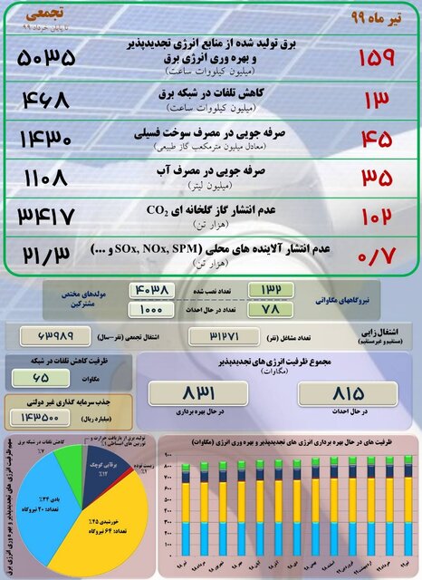انرژیهای تجدیدپذیر و بهرهوری برق صرفهجویی در مصرف سوختهای فسیلی به میزان ۱۴۳۰ معادل میلیون مترمکعب گاز طبیعی را در تیرماه محقق کرد.
