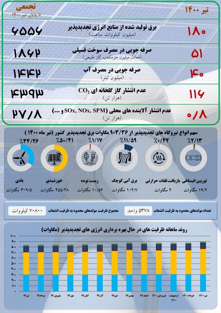 همچنین استفاده از انرژیهای تجدیدپذیر در تیرماه امسال صرفهجویی ۱۴۴۲ میلیون لیتری آب را به همراه داشت، علاوه بر این انرژیهای تجدیدپذیر و بهرهوری برق صرفهجویی در مصرف سوختهای فسیلی به میزان ۱۸۶۲ معادل میلیون مترمکعب گاز طبیعی را در مهرماه محقق کرد.