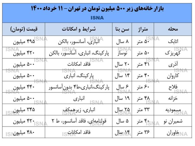 بررسی فایلهای عرضهشده به بازار مسکن شهر تهران نیز نشان میدهد که میتوان در محلههایی مثل اتابک، شهرری، تقیآباد، شوش، یافتآباد، آذری، فلاح، خزانه، علیآباد، شریفآباد و شهرک کاروان با نقدینگی حدود ۵۰۰ میلیون تومان آپارتمان، زمین یا خانه کلنگی خریداری کرد.