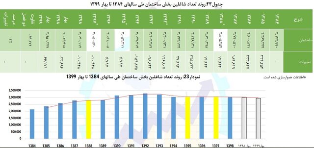 علیرغم شیوع ویروس کرونا از اسفند سال گذشته، کاهش ۲.۲ درصدی تعداد شاغلین بخش ساختمان در بهار ۱۳۹۹ نسبت به بهار ۱۳۹۸ را نمیتوان ناشی از این امر دانست چراکه قبل از آن هم در برخی سالها ساختوساز رشد چندانی نداشته است.