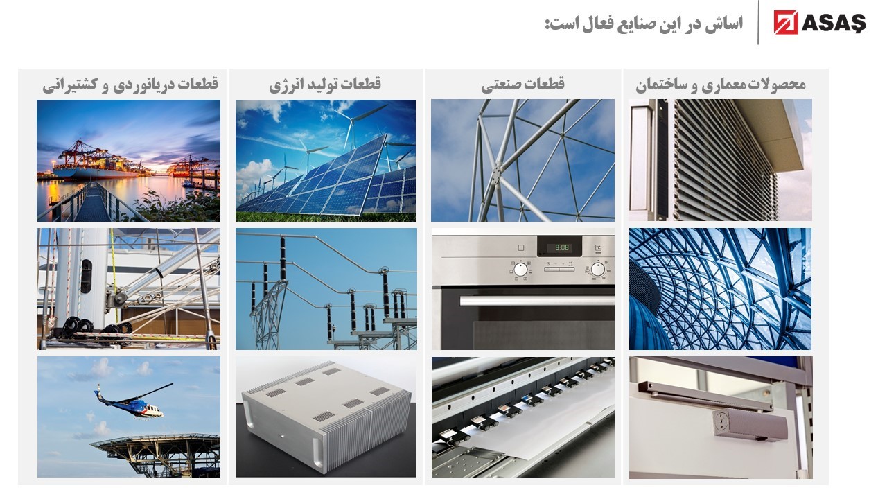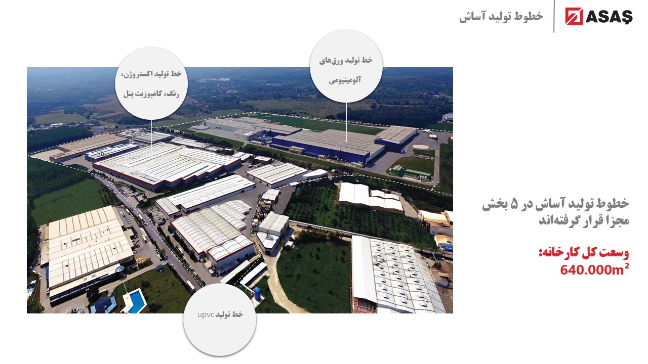 وی افزود: 80 درصد تولیدات آساش به بخش صادرات اختصاص پیدا میکند و تنها 20 درصد آن مصرف داخلی دارد. آساش در بخش آلومینیوم یک شرکت خودکفا است یعنی صفر تا صد یک محصول آلومینیومی از بیلت تا محصول نهایی و کلیه فرآیندهای میانی مانند تولید قالب در خود مجموعه آساش انجام میگیرد. ظرفیت تولید بیلت آساش در سال 90 هزار تن، اکستروژن 75 هزار تن و آنادایز 40 هزار تن است. ظرفیت تولید ورق یا فویل آلومینیومی آساش 140 هزار تن و ظرفیت خط تولید یو.پی.وی.سی آساش نیز 35 هزار تن در سال است. آساش 26 خط تولید اکستروژن یو پی وی سی دارد که هرکدام میتوانند بهصورت مستقل و مجزا و با فرمولاسیون جداگانه کار کنند.
