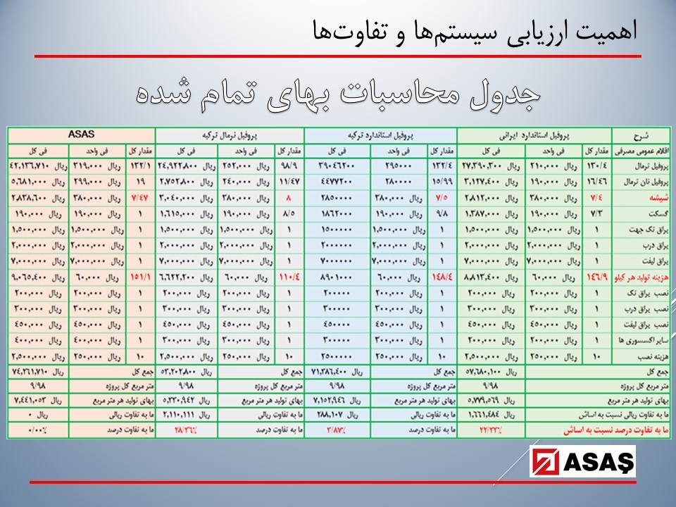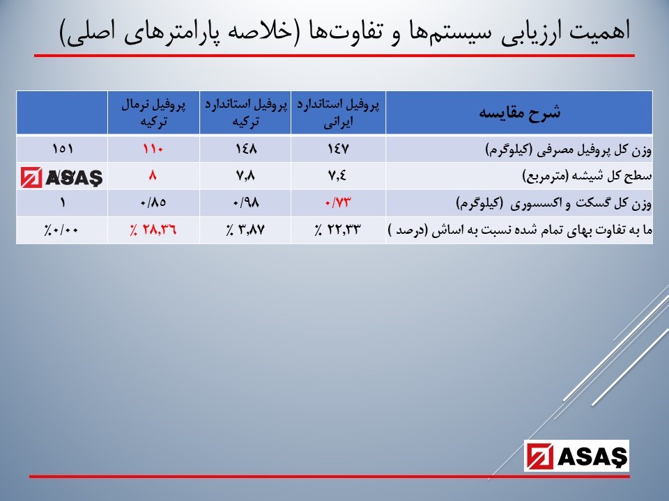 مدیر بازرگانی گروتمان افزود: همانطور که در تصاویر میبینید جداول مربوط به مباحث مختلف بررسیشده با ثبت اعداد و ارقام و طبق مقایسههای ارائه شده نشان داده شد که پروفیل های استاندارد داخلی و وارداتی از بسیاری جهات مانند وزن پروفیل، میزان مصرف اکسسوریهای آببندی و هوابندی و سطح شیشه مشابه هستند اما پروفیلهای وارداتی غیر استانداردی هم بوده که دارای ضعفهای مشهودی در این مواد بودهاند. در واقع هدف از این مقایسه، بررسی تطبیقی و ملاحظات در انتخاب پروفیل استاندارد از پروفیلهای متفرقه داخلی و وارداتی است. با توجه به اینکه عموما در بازار ایران، مشتریان برای مقایسه سیستمها صرفا به معیار کشور سازنده توجه دارند، این مقایسه درک این موضوع و تفکیک آنها را شفافتر خواهد کرد و فروشنده و مصرفکننده صرف وارداتی یا تولید داخل اقدام به تفکیک نخواهد کرد. همچنین این جدول گویای مزایا و برتریهای نسبی و در مواردی قابلتوجه سیستمهای آساش نسبت به سایر گزینهها است.