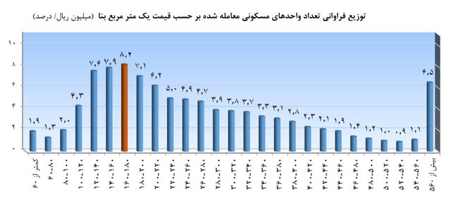 مهرماه ۱۳۹۹ توزیع فراوانی معاملات مسکن شهر تهران برحسب قیمت یک مترمربع حاکی از آن است که بیشترین سهم به میزان ۸.۲ درصد به واحدهای دارای ارزش ۱۶ تا ۱۸ میلیون تومان در هر مترمربع تعلق دارد و خانههای با قیمت متری ۱۴ تا ۱۶ میلیون و ۱۲ تا ۱۴ میلیون تومان به ترتیب با سهم ۷.۹ و ۷.۶ درصد در رتبههای بعدی قرار دارند. بهطورکلی ۴۰ درصد معاملات مربوط به خانههای کمتر از متری ۲۰ میلیون تومان بوده است.